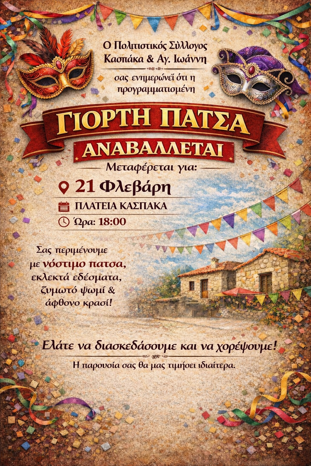 Ο Πολιτιστικός Σύλλογος Κάσπακα και Αγ. Γιάννη μας προσκαλεί να διασκεδάσουμε και να χορέψουμε, στη “ΓΙΟΡΤΗ ΠΑΤΣΑ” και Παραδοσιακό Αποκριάτικο Γλέντι στην πλατεία του χωριού, το Σάββατο 21 Φεβρουαρίου, στις 6:00 το απόγευμα.