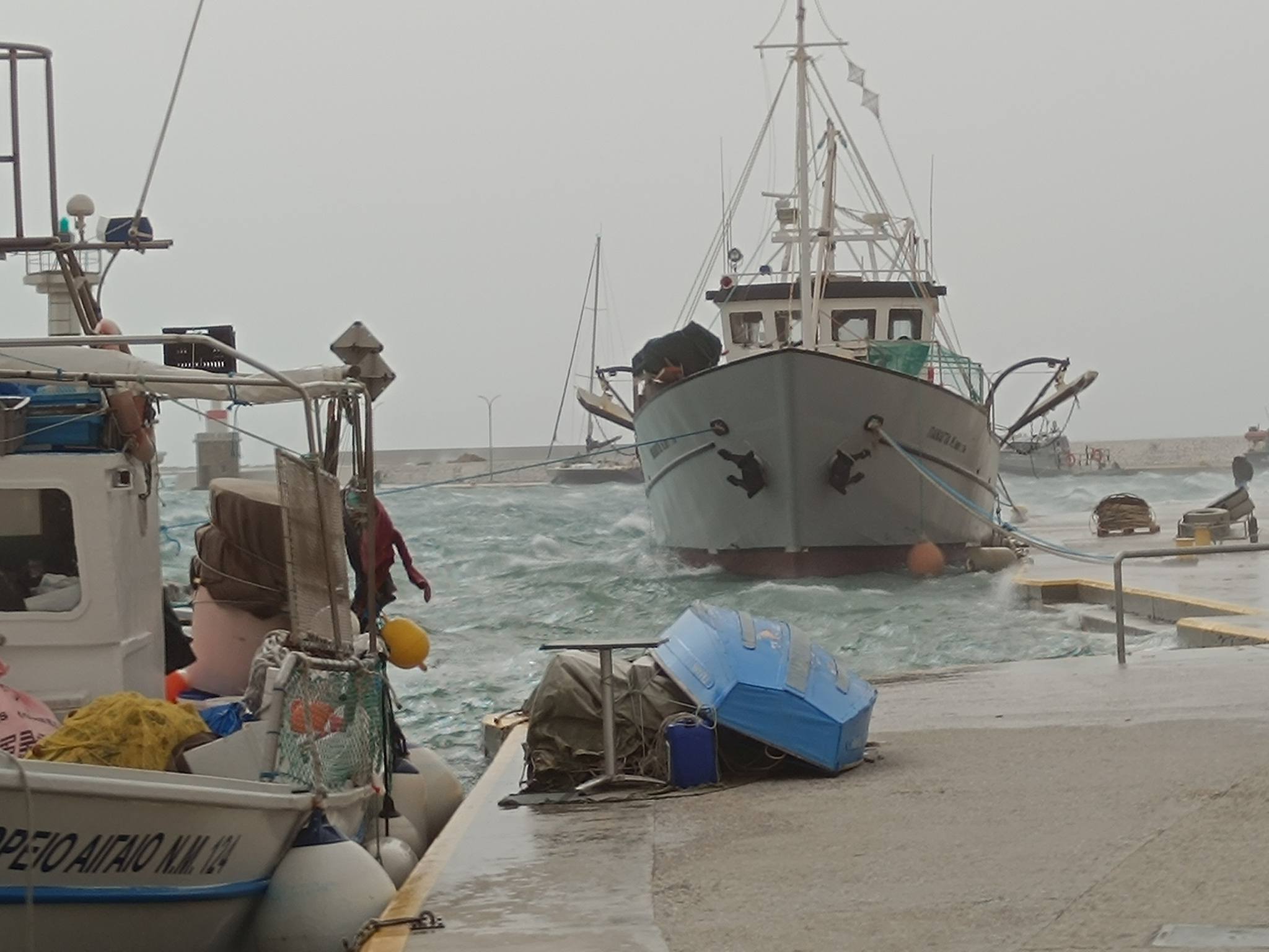 Από τους ισχυρούς ανέμους χτυπήθηκε όλο το νησί, στα λιμάνια Μύρινας και Μούδρου, αλλά και στα άλλα μικρότερα λιμάνια του νησιού, οι βάρκες και τα καΐκια έμοιαζαν καρυδότσουφλα στο κύμα.