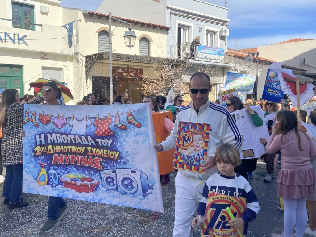 Η πολύχρωμη πορεία ξεκίνησε από το Γυμνάσιο Μύρινας και, διασχίζοντας κεντρικούς δρόμους της πόλης, κατέληξε στο παλιό λιμάνι, μπροστά στο Δημαρχείο, όπου το γιορτινό κλίμα κορυφώθηκε με μουσική και χορό.