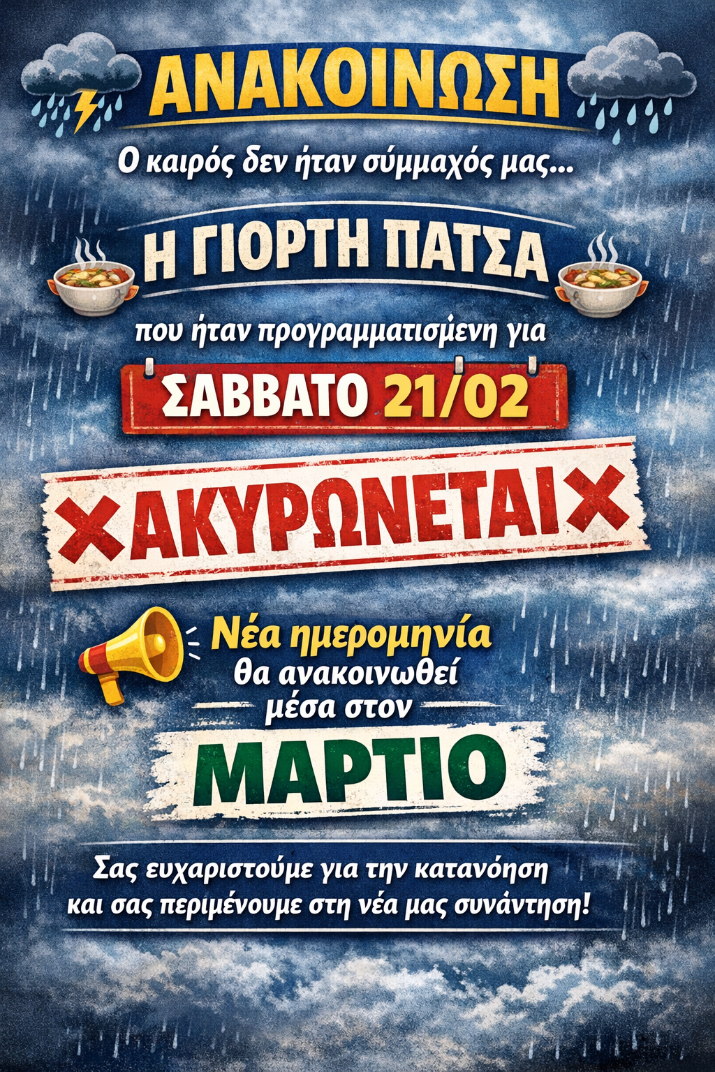 Μετά από μία αναβολή λόγω καιρού και με τις προβλέψεις να δίνουν πάλι βροχές, ο Σύλλογος του Κάσπακα αποφάσισε να ακυρώσει τη Γιορτή Πατσά που είχε προγραμματίσει για το Σάββατο 21 Φεβρουαρίου.