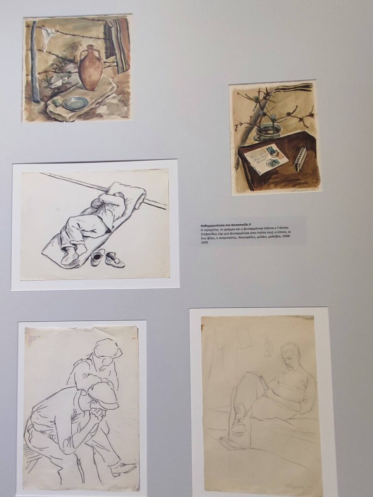 “Οι αναγνώστες” μελάνι 1949, “Γιάννης Ρίτσος” μελάνι 1949 (πάνω δεξιά), “Ο Πανούσης” 1948 και ο “Ντικ” μολύβι 1949. “…. τώρα κοιμάται στη Λήμνο δείχνοντας πάντα το ζερβί του δόντι. Μπορεί μεθαύριο να τον ακούσουμε πάλι να γαβγίζει χαρούμενος σε μια διαδήλωση περνοδιαβαίνοντας κάτου απ’ τις σημαίες μας έχοντας κρεμασμένη στο ζερβί του δόντι μια μικρή πινακίδα” Κάτω οι τύραννοι…” Γιάννης Ρίτσος Τα επικαιρικά, “Πέτρινος χρόνος “.