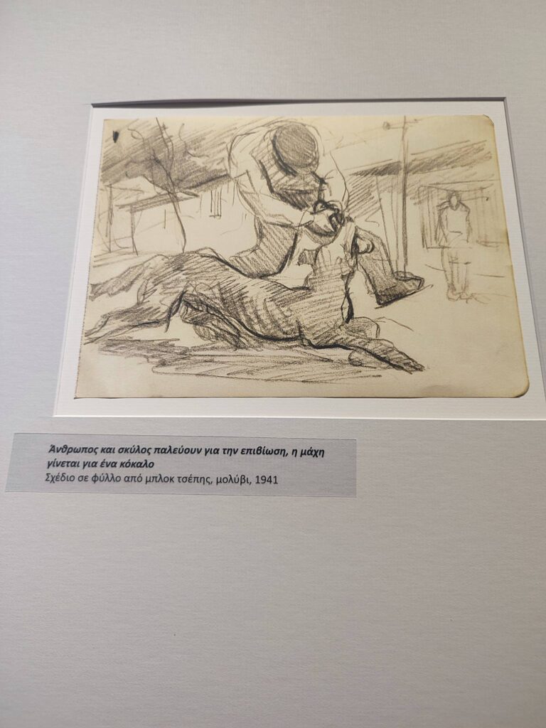 Άνθρωπος και σκύλος παλεύουν για την επιβίωση, η μάχη γίνεται για το κόκκαλο. Σκηνή της περιόδου της Κατοχής. Σχέδιο σε μπλοκ τσέπης μολύβι 1941.