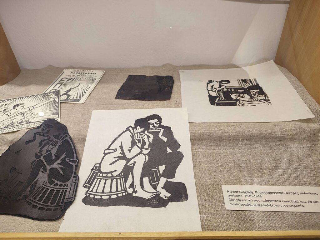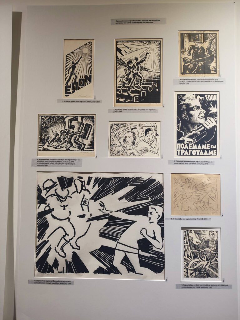 Έργα από το καλλιτεχνικό συνεργείο της ΕΠΟΝ που στεγαζόταν στο ατελιέ του Γιάννη Στεφανίδη στην οδό Καπλανών. Ξεχωρίζει και το πρωτότυπο σήμα της ΕΠΟΝ μελάνι 1943.