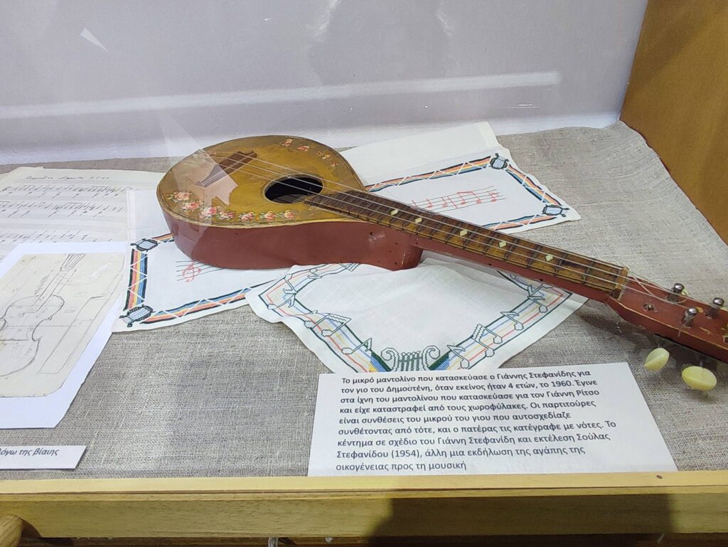 Το μικρό μαντολίνο που κατασκεύασε ο Γιάννης Στεφανίδης για τον γιο του Δημοστένη, όταν εκείνος ήταν 4 ετών, το 1960. Έγινε στα ίχνη του μαντολίνου που κατασκεύασε για τον Γιάννη Ρίτσο και είχε καταστραφεί από τους Χωροφύλακες. Οι παρτιτούρες είναι συνθέσεις του μικρού του γιου που αυτοσχεδίαζε συνθέτοντας από τότε και ο πατέρας τις κατέγραφε με νότες. Το κέντημα σε σχέδιο του Γιάννη Στεφανίδη και εκτέλεση Σούλας Στεφανίδη (1954), άλλη μια εκδήλωση αγάπης της οικογένειας προς τη μουσική.