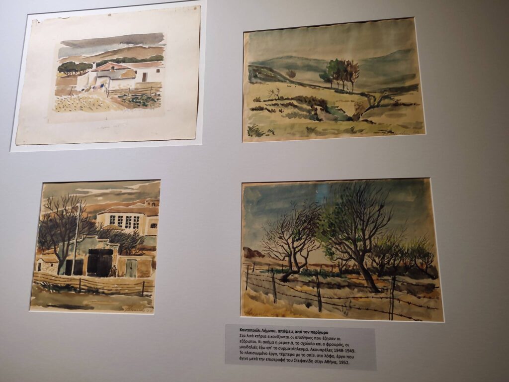 φωτογραφία 2: Κοντοπούλι Λήμνου – απόψεις από τον περίγυρο. Στα λιτά κτήρια εικονίζονται οι αποθήκες που έζησαν οι εξόριστοι. Η ρεματιά, το σχολείο και ο φρουρός, οι μυγδαλιές έξω απ’το συρματόπλεγμα. Ακουαρέλες 1948-49.