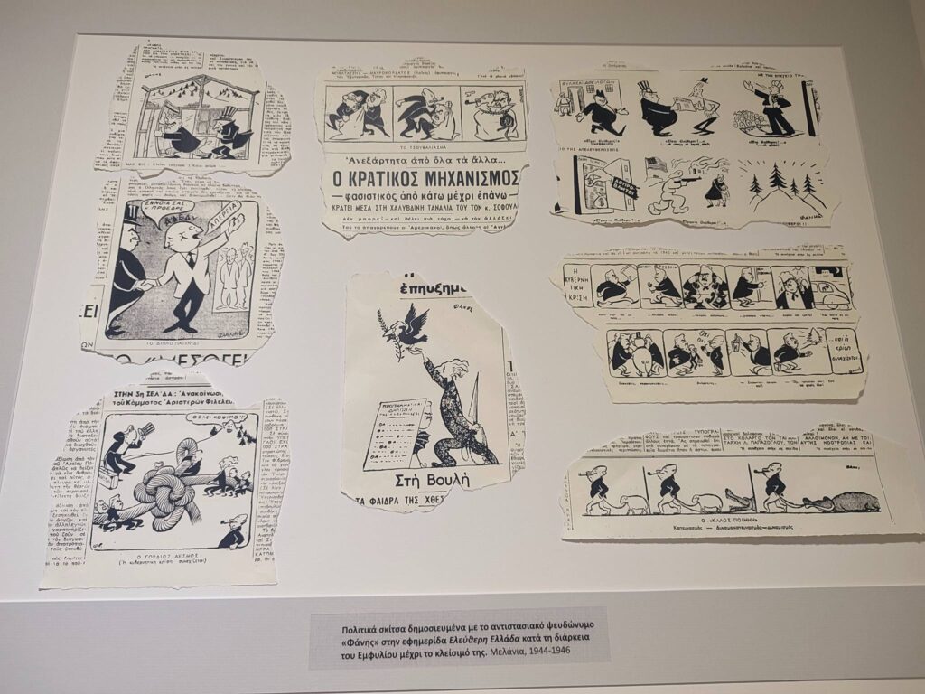 Πολιτικά σκίτσα δημοσιευμένα με το αντιστασιακό ψευδώνυμο “Φάνης” στην εφημερίδα “Ελεύθερη Ελλάδα” κατά τη διάρκεια του Εμφυλίου μέχρι το κλείσιμό της, μελάνια 1944-46.