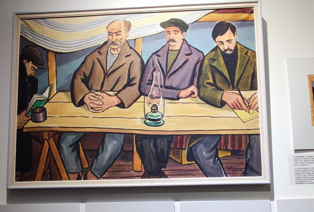 φωτογραφία 3: “Οι ομοτράπεζοι” προσχέδιο με πυκνή ακουαρέλα (1949) που οδήγησε στον πίνακα με λάδι μετά την επιστροφή του στην Αθήνα (1958).