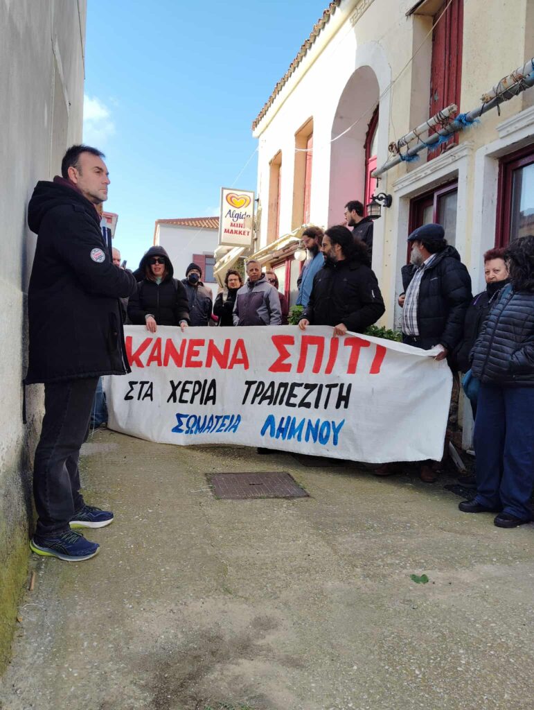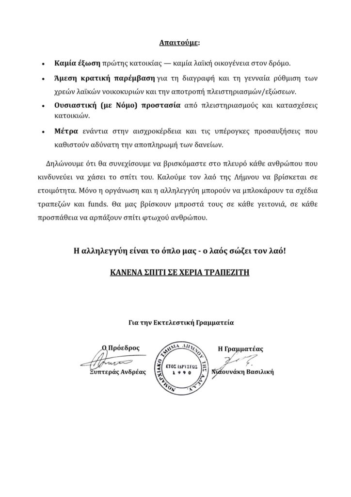 Δηλώνουμε ότι θα συνεχίσουμε να βρισκόμαστε στο πλευρό κάθε ανθρώπου που κινδυνεύει να χάσει το σπίτι του. Καλούμε τον λαό της Λήμνου να βρίσκεται σε ετοιμότητα. Μόνο η οργάνωση και η αλληλεγγύη μπορούν να μπλοκάρουν τα σχέδια τραπεζών και funds. Θα μας βρίσκουν μπροστά τους σε κάθε γειτονιά, σε κάθε προσπάθεια να αρπάξουν σπίτι φτωχού ανθρώπου.