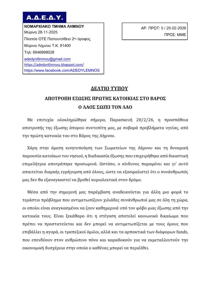 Χάρη στην άμεση κινητοποίηση των Σωματείων της Λήμνου και τη δυναμική παρουσία κατοίκων του νησιού, η διαδικασία έξωσης που επιχειρήθηκε από δικαστική επιμελήτρια αποτράπηκε προσωρινά. Ωστόσο, ο κίνδυνος παραμένει και γι’ αυτό απαιτείται διαρκής εγρήγορση από όλους, ώστε να εξασφαλιστεί ότι ο συνάνθρωπός μας δεν θα εξαναγκαστεί να βρεθεί κυριολεκτικά στον δρόμο.