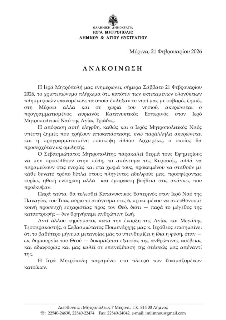 ΑΝΑΚΟΙΝΩΣΗ 21.2.2026 ΠΕΡΙ ΤΗΣ ΑΚΥΡΩΣΕΩΣ ΤΟΥ ΚΑΤΑΝΥΚΤΙΚΟΥ ΕΣΠΕΡΙΝΟΥ ΣΤΗΝ ΠΟΛΗ ΛΟΓΩ ΖΗΜΙΩΝ ΤΟΥ ΜΗΤΡΟΠΟΛΙΤΙΚΟΥ ΝΑΟΥ ΕΚ ΤΩΝ ΕΚΤΕΤΑΜΕΝΩΝ ΠΛΗΜΜΥΡΙΚΩΝ ΦΑΙΝΟΜΕΝΩΝ