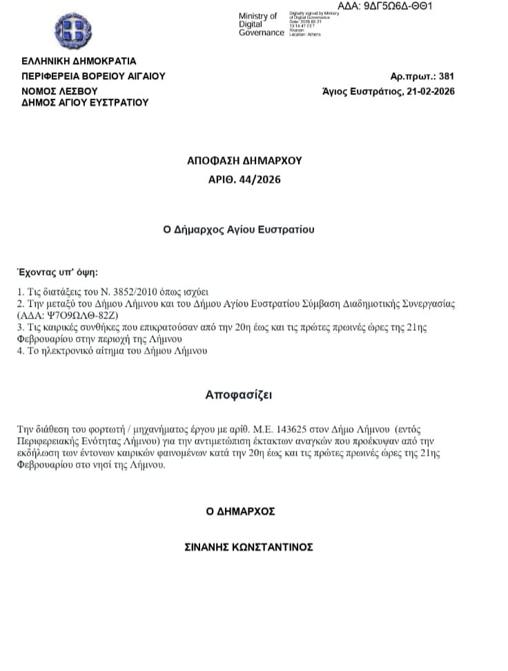 Ο Δήμος Αγίου Ευστρατίου στο πλαίσιο της αγαστής συνεργασίας και της κοινωνικής ευθύνης συνδράμει τον Δήμο Λήμνου, κατά το δυνατόν, στην αντιμετώπιση των εκτάκτων αναγκών που προέκυψαν από την εκδήλωση των έντονων καιρικών φαινομένων χθες και σήμερα. Γι’ αυτό απέστειλε σήμερα μηχάνημα έργου (φορτωτή) προκειμένου να συνδράμει στις εργασίες αποκατάστασης του οδικού δικτύου και του καθαρισμού φερτών υλικών.