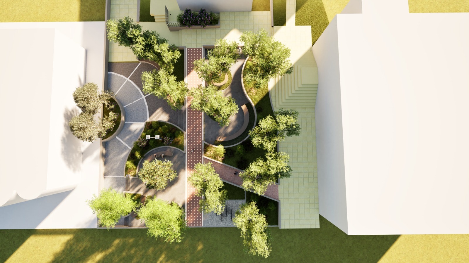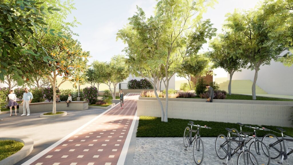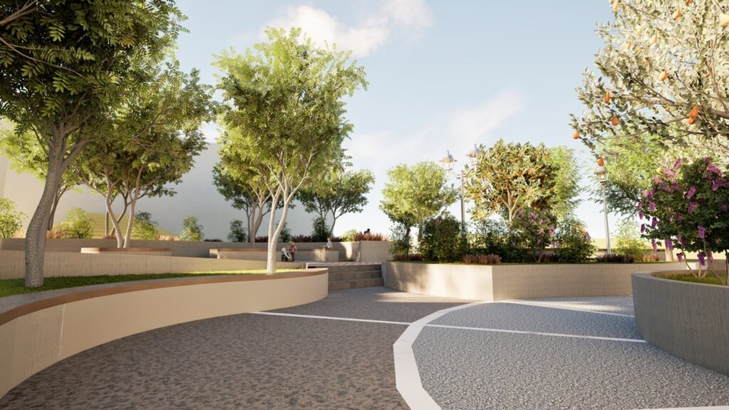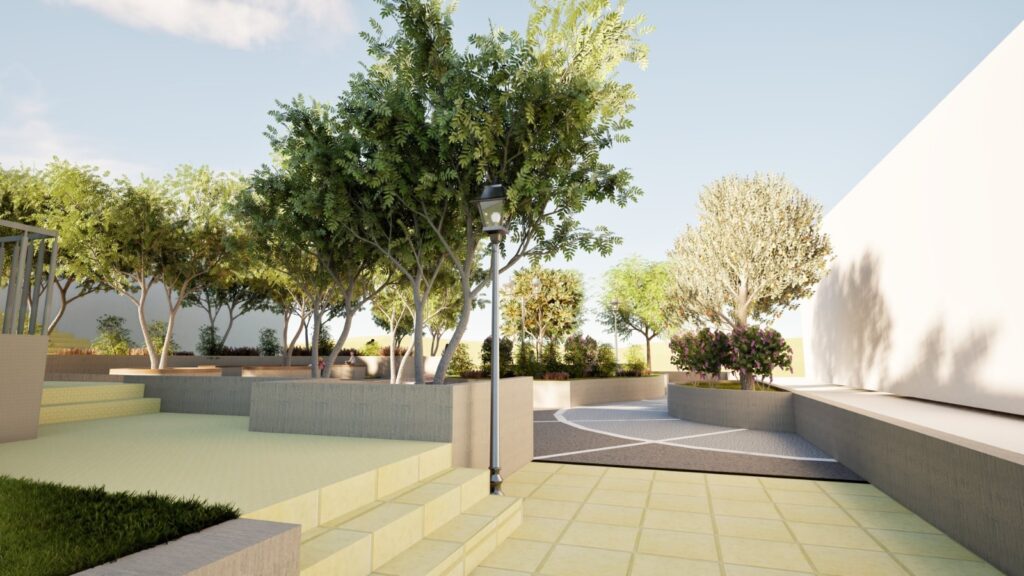Ταυτόχρονα, προσθέτει χρώμα, επιτυγχάνοντας την αισθητική αναβάθμιση του χώρου. Αυξάνονται και ενοποιούνται μερικώς οι χώροι πρασίνου, μεταφέρεται σε καλύτερη θέση 1 δέντρο, για την αρμονικότερη λειτουργεία του Κ.Χ. και προστίθεται ένα επιπλέον δέντρο για μεγαλύτερη σκίαση στα καθιστικά. Αναδιαμορφώνονται οι χώροι σε διαφορετικές ζώνες, δημιουργούνται νέοι χώροι στάσης και συγκέντρωσης. Ενσωματώνονται σύγχρονα και φιλικά προς το περιβάλλον υλικά, ώστε ο χώρος να ανταποκρίνεται στις ανάγκες ενός πολυλειτουργικού και ζωντανού Κ.Χ.