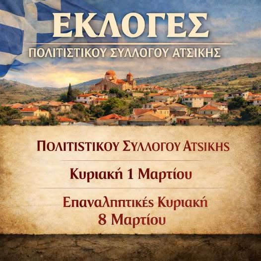 Με αφορμή τις πρόσφατες ανακοινώσεις και στο πλαίσιο της ομαλής και δημοκρατικής λειτουργίας του Πολιτιστικού Συλλόγου Ατσικής, το Διοικητικό Συμβούλιο προχωρά στη διεξαγωγή εκλογών για την ανάδειξη νέου Διοικητικού Συμβουλίου.