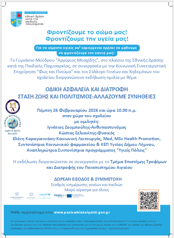 Η εκδήλωση εντάσσεται στις δραστηριότητες της Εθνικής δράσης κατά της παιδικής παχυσαρκίας και υλοποιείται σε συνεργασία με το Τμήμα Επιστήμης Τροφίμων και Διατροφής του Πανεπιστημίου Αιγαίου
