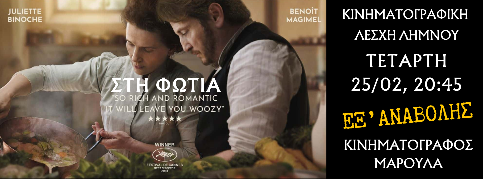 H Κινηματογραφική Λέσχη Λήμνου κάνει το μεγάλο βήμα, κόντρα στις “κακιές γλώσσες” που μας κατηγορούν ότι δείχνουμε μόνο “σοβαρές, βαριές και στενάχωρες ταινίες”, και φέρνει στη μεγάλη οθόνη του «Μαρούλα» την βραβευμένη αισθηματική ταινία εποχής «Στη Φωτιά», με την αγαπημένη του ελληνικού κοινού Ζιλιέτ Μπινός.