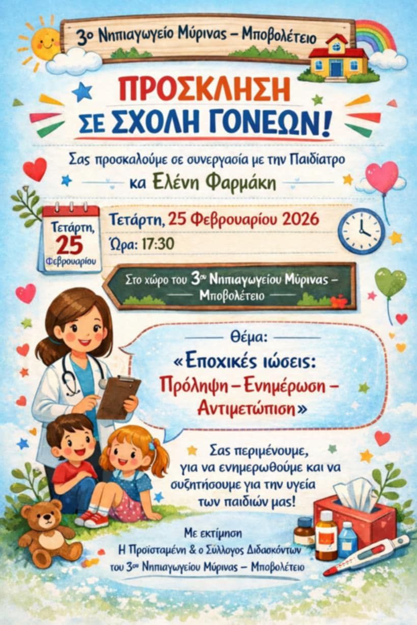 Το 3ο Νηπιαγωγείο Μύρινας – Μποβολέτειο σε συνεργασία με την παιδίατρο κ. Ελένη Φαρμάκη μας προσκαλεί σε Σχολή Γονέων σήμερα Τετάρτη 25 Φεβρουαρίου, στις 17:30, με θέμα τις “Εποχικές Ιώσεις”.