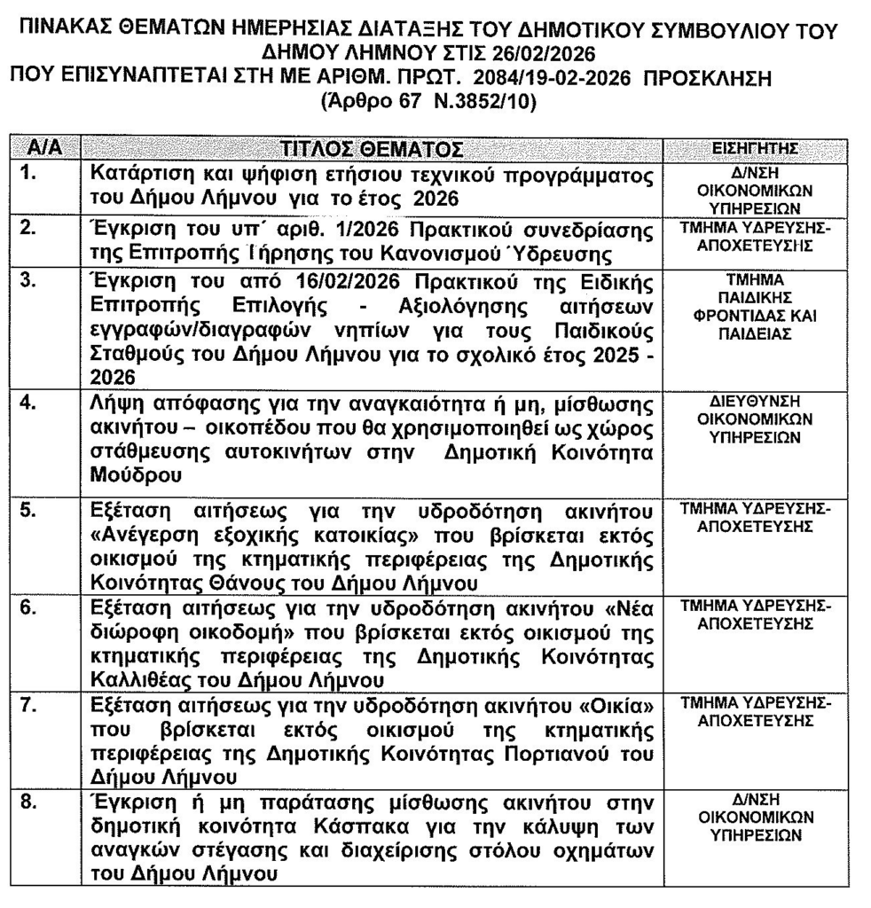 Τακτική συνεδρίαση του Δημοτικού Συμβουλίου, θα διεξαχθεί στην αίθουσα συνεδριάσεων του Δημοτικού Συμβουλίου Λήμνου, στην Πλατεία Υψιπύλης (Πλατεία ΟΤΕ) στο Παπουτσίδειο Δημοτικό Μέγαρο, 1ος όροφος, 04 γραφείο, την 26η Φεβρουαρίου , ημέρα Πέμπτη και ώρα 17.00,