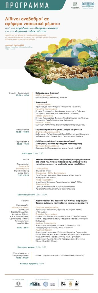 Η Γενική Γραμματεία Αιγαίου και Νησιωτικής Πολιτικής του Υπουργείου Ναυτιλίας και Νησιωτικής Πολιτικής, σε συνεργασία με τον Οργανισμό για τη Φύση και τον Άνθρωπο (MedINA), σας προσκαλεί στην ημερίδα με τίτλο: «Λίθινοι αναβαθμοί σε εφήμερα νησιωτικά ρέματα: Από την παράδοση στη θεσμική ενίσχυση για την κλιματική ανθεκτικότητα». Η ημερίδα επικεντρώνεται στην αξιοποίηση παραδοσιακών πρακτικών ως Λύσεων βασισμένων στη Φύση, με στόχο την ολοκληρωμένη διαχείριση υδατικών πόρων στα νησιά του Αιγαίου.