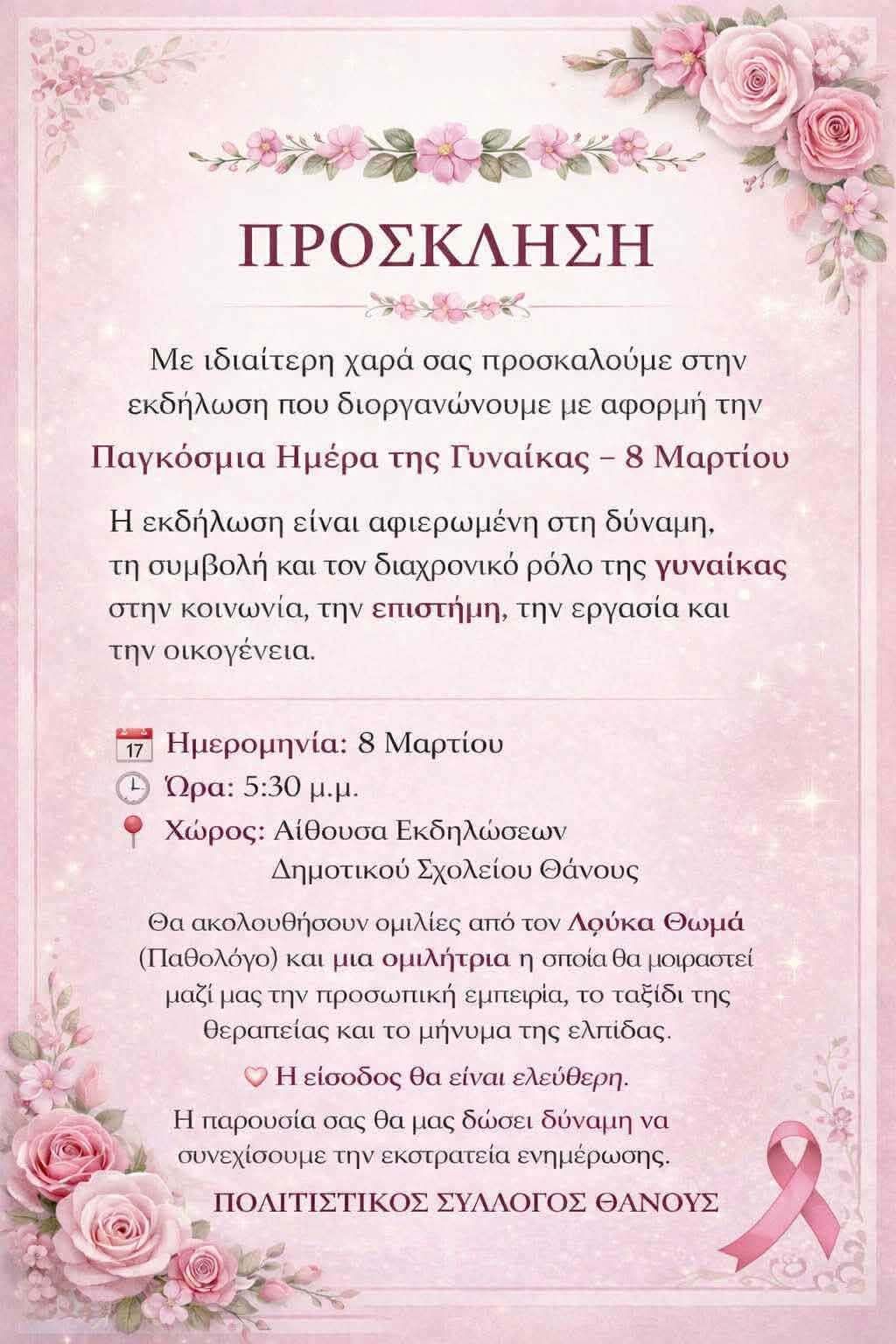 Ο Πολιτιστικός Σύλλογος Θάνους διοργανώνει εκδήλωση την Κυριακή 8 Μαρτίου, Παγκόσμια Ημέρα της Γυναίκας, στις 5:30μμ, στην Αίθουσα Εκδηλώσεων του Δημοτικού Σχολείου.