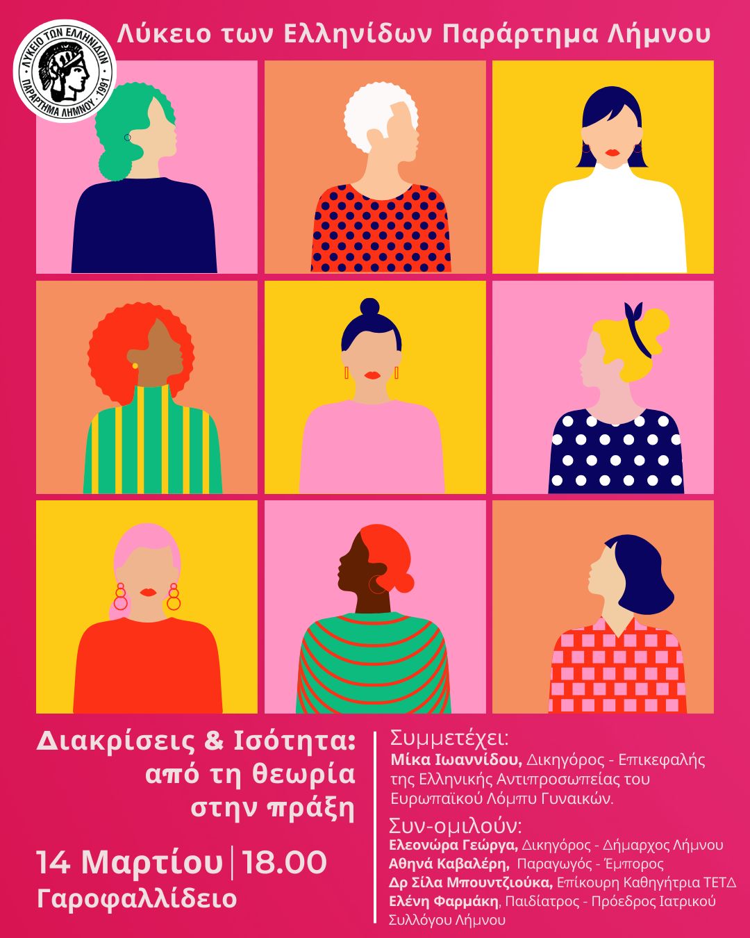 Το Λύκειο των Ελληνίδων Λήμνου, με αφορμή την Παγκόσμια Ημέρα της Γυναίκας, σας προσκαλεί σε μια ξεχωριστή εκδήλωση ενημέρωσης και ευαισθητοποίησης με τίτλο “Διακρίσεις και Ισότητα: Από τη θεωρία στην πράξη”, το Σάββατο 14 Μαρτίου, στις 6μ.μ., στο Γαροφαλλίδειο Αμφιθέατρο.