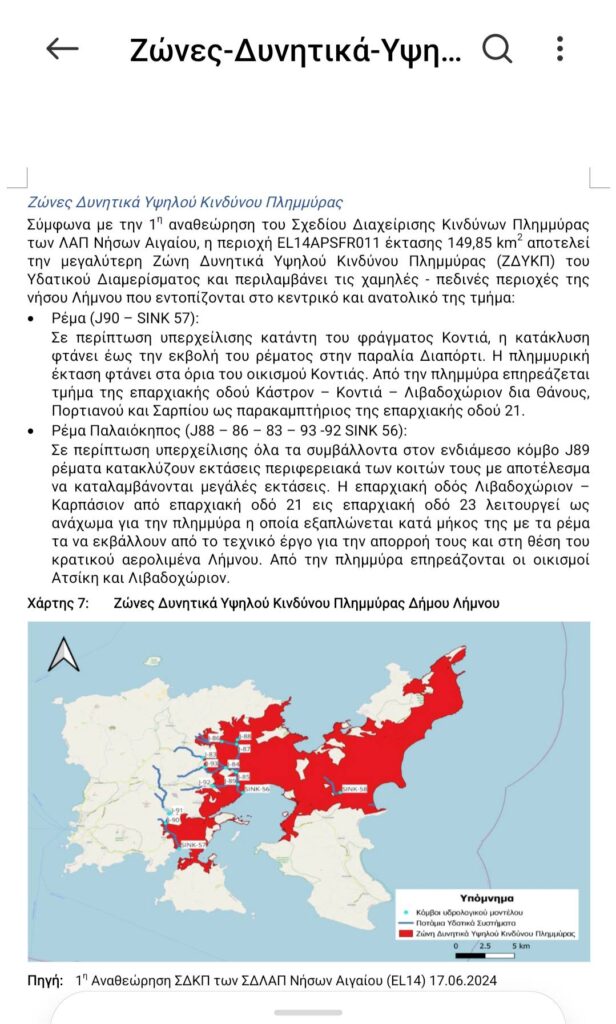 Σύμφωνα με όσα ανέφερε, υπάρχει ΦΕΚ 87/12.06.2024, στο οποίο καταγράφονται οι περιοχές της χώρας ως προς τον κίνδυνο πλημμυρών. Στο συγκεκριμένο σχέδιο η Λήμνος χαρακτηρίζεται «κόκκινη» περιοχή, λόγω της γεωλογίας του εδάφους και της αυξημένης επικινδυνότητας για πλημμυρικά φαινόμενα.