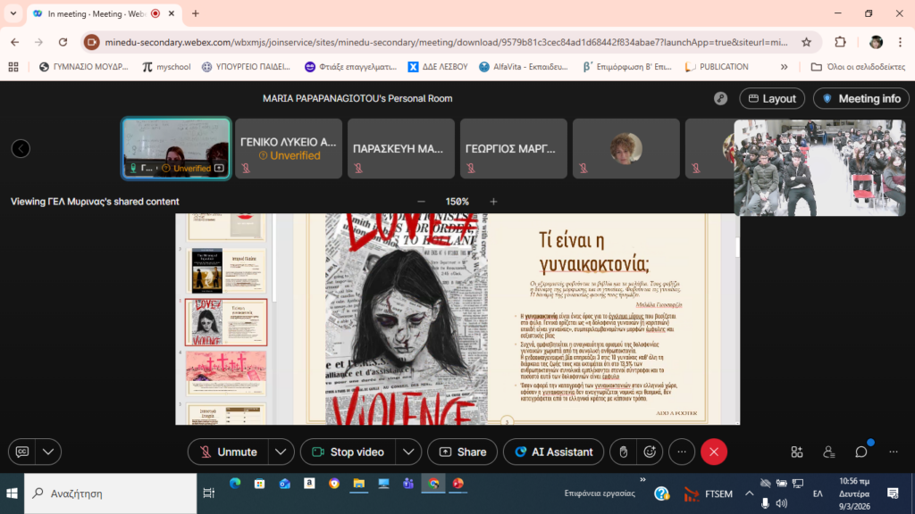 • Το Γενικό Λύκειο Μύρινας παρουσίασε εργασία με τίτλο «Γυναικοκτονία: μια λέξη που ακόμη δεν έχει νομιμοποιηθεί», αναδεικνύοντας την ανάγκη αναγνώρισης και αντιμετώπισης του φαινομένου. Το σχολείο ευχαριστήθηκε θερμά για την ουσιαστική συμμετοχή και τη συνεργασία του, παρόλο που δεν ανήκει στο δίκτυο σχολείων EPAS.