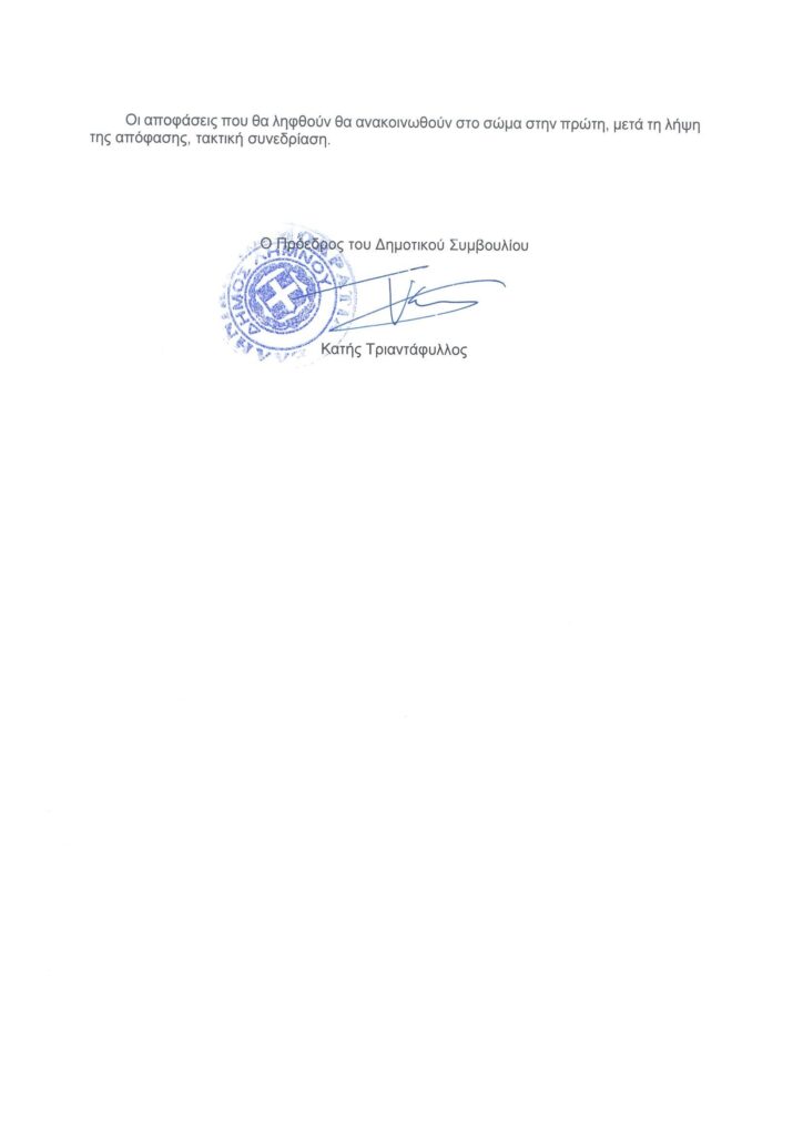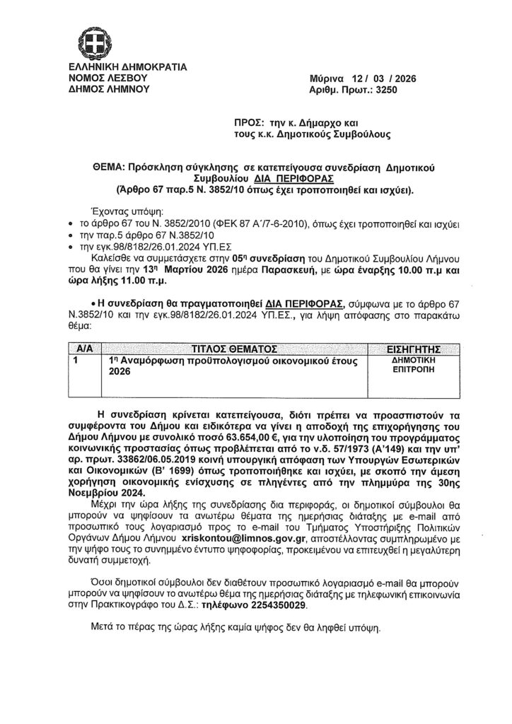 Πρόσκληση έκτακτης κατεπείγουσας συνεδρίαση του Δημοτικού Συμβουλίου ΔΙΑ ΠΕΡΙΦΟΡΑΣ θα πραγματοποιηθεί αύριο Παρασκευή 13 Μαρτίου. Αφορά την Αναδιαμόρφωση του Προϋπολογισμού΄.