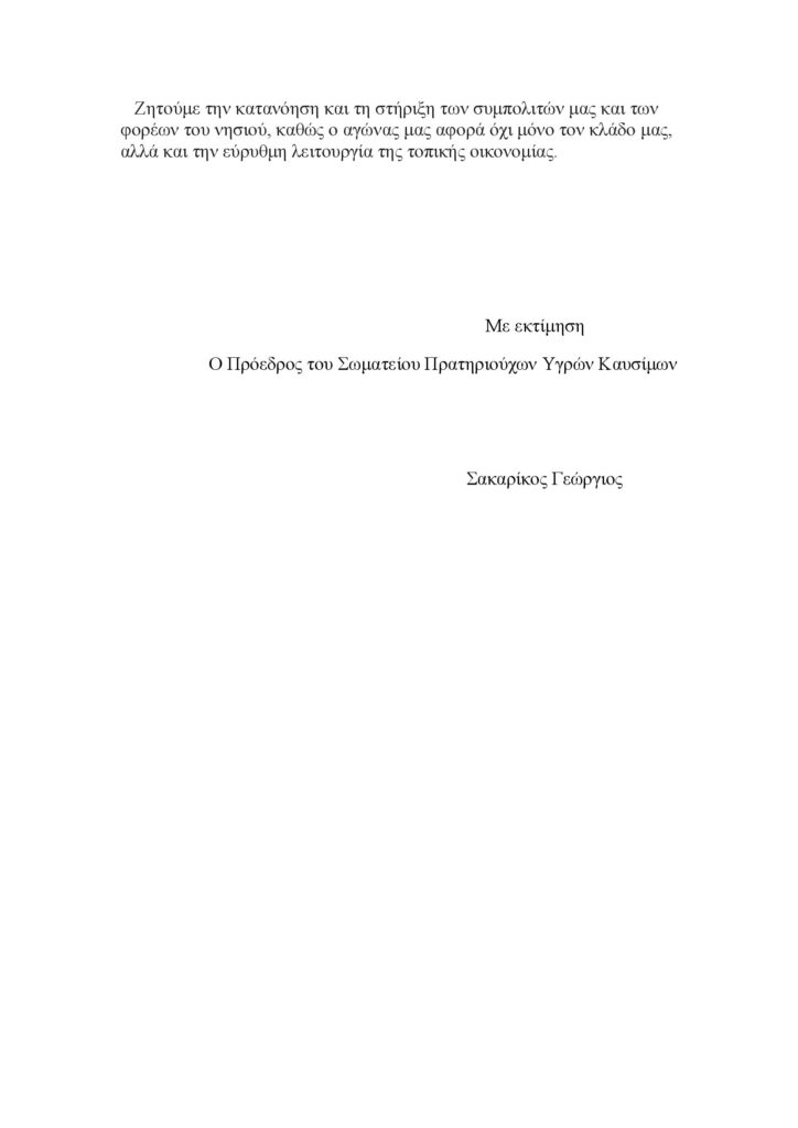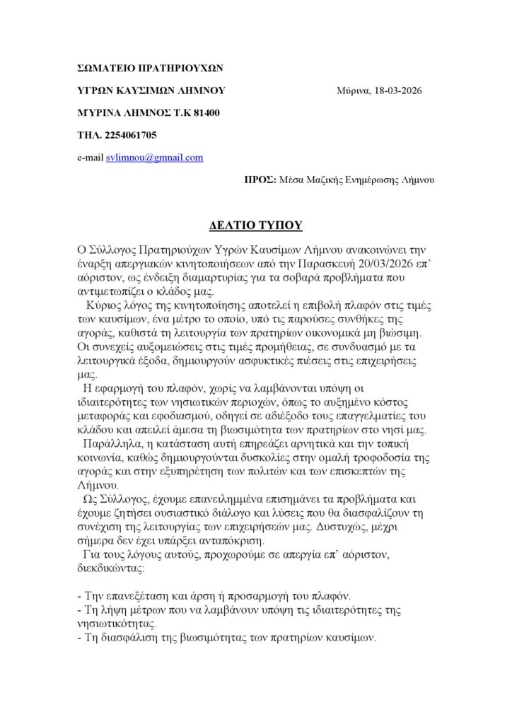 Ο Σύλλογος Πρατηριούχων Υγρών Καυσίμων Λήμνου ανακοινώνει την έναρξη απεργιακών κινητοποιήσεων από την Παρασκευή 20/03/2026 επ’ αόριστον, ως ένδειξη διαμαρτυρίας για τα προβλήματα που αντιμετωπίζει ο κλάδος.