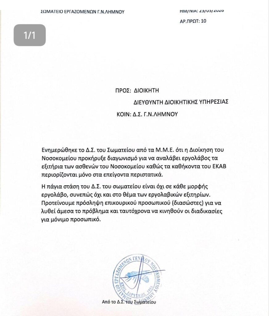 Παρέμβαση προς τη διοίκηση του Γενικού Νοσοκομείου Λήμνου πραγματοποίησε το Διοικητικό Συμβούλιο του Σωματείου Εργαζομένων, εκφράζοντας την έντονη αντίθεσή του σε απόφαση που αφορά τη μετακίνηση ασθενών μετά το εξιτήριό τους.