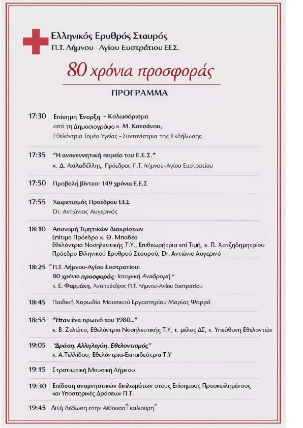 Χτες Δευτέρα 23 Μαρτίου, στο Κινηματοθέατρο Μαρούλα τιμήθηκαν τα 80 χρόνια του Περιφερειακού Τμήματος Λήμνου και Αγίου Ευστρατίου του Ελληνικού Ερυθρού Σταυρού.