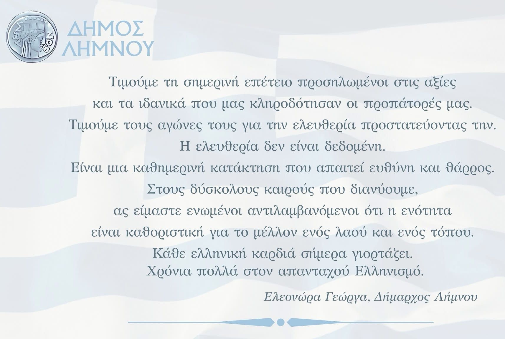 Μήνυμα της Δημάρχου Λήμνου κ. Ελεονώρας Γεώργα για την επέτειο της 25ης Μαρτίου