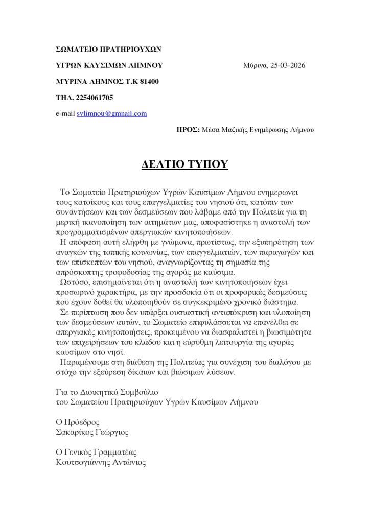 Την αναστολή της απεργίας τους αποφάσισαν οι πρατηριούχοι υγρών καυσίμων του νησιού μας, μετά από τη μερική ικανοποίηση των αιτημάτων τους και τις δεσμεύσεις από την πολιτεία.