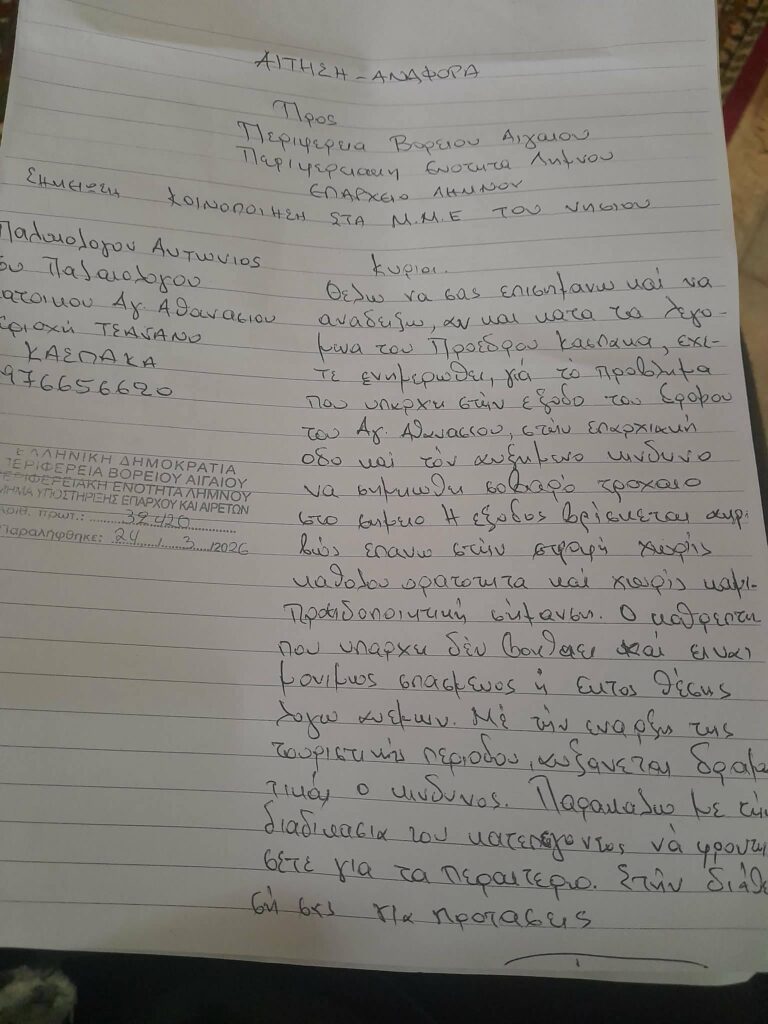 Κάτοικος της περιοχής που διαμένει στην περιοχή, επισημάνει και εγγράφως προς την ΠΕ Λήμνου την επικινδυνότητα της κατάστασης. Στο σημείο που διασταυρώνονται οι δρόμοι δεν υπάρχει ορατότητα, ούτε η απαραίτητη σήμανση και αυτό θα μπορούσε να αποτελέσει αιτία σοβαρού τροχαίου για ντόπιους και τουρίστες.