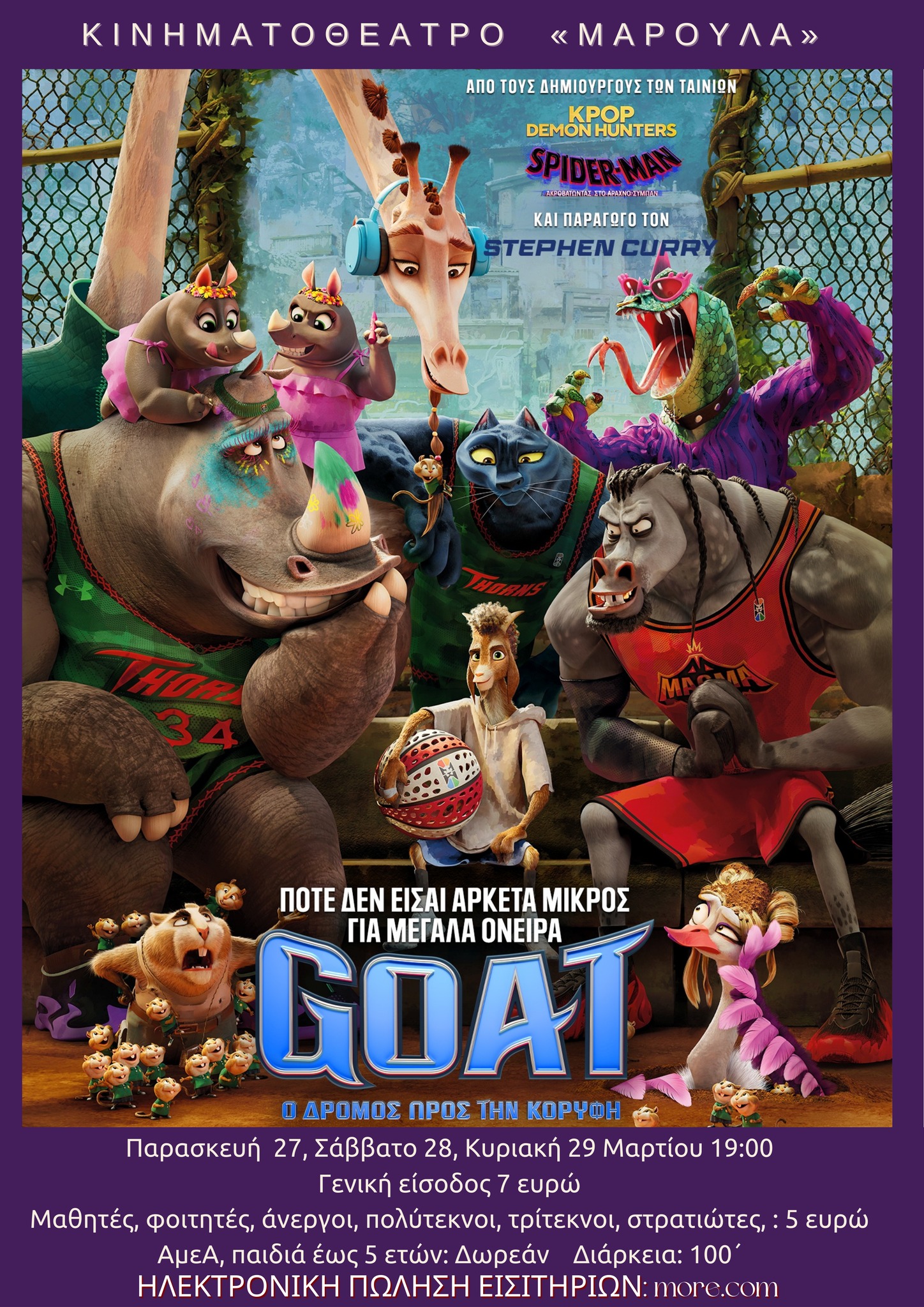 Η ταινία κινουμένων σχεδίων “GOAT: Ο δρόμος προς την κορυφή” που προβάλλεται στο κινηματοθάτρο “Μαρούλα” στις 27, 28 και 29 Μαρτίου, είναι μια πρωτότυπη κωμωδία δράσης που διαδραματίζεται σε έναν κόσμο όπου ζουν μόνο ζώα.