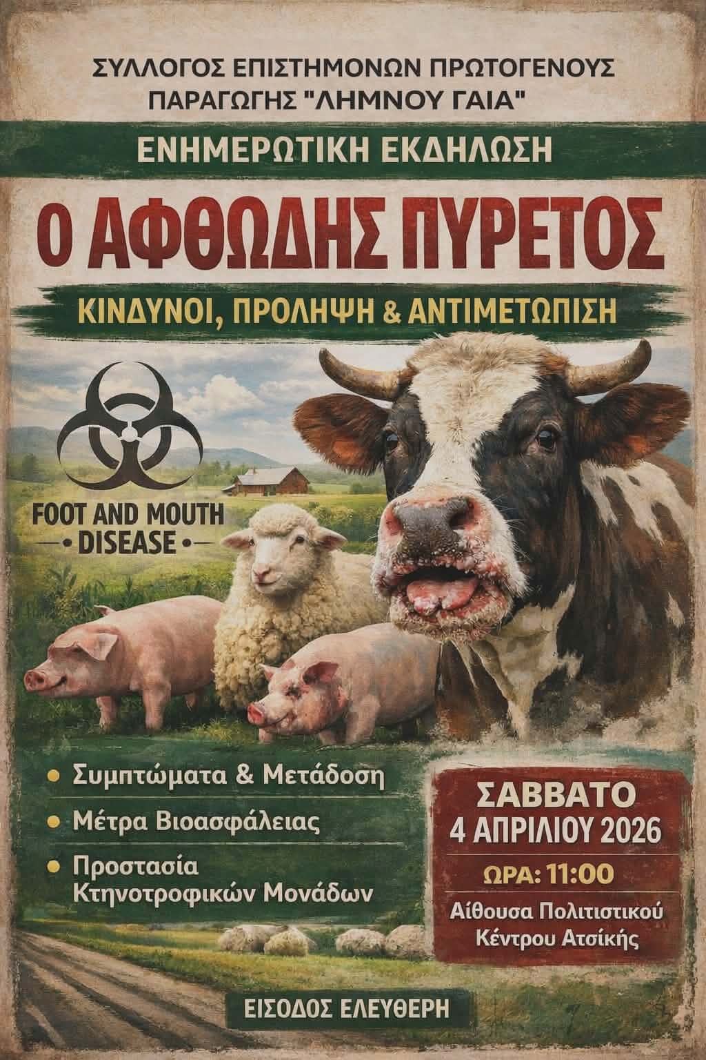 Ο ΛΗΜΝΟΥ ΓΑΙΑ διοργανώνει ενημερωτική ημερίδα με θέμα: «ΑΦΘΩΔΗΣ ΠΥΡΕΤΟΣ», η οποία θα πραγματοποιηθεί