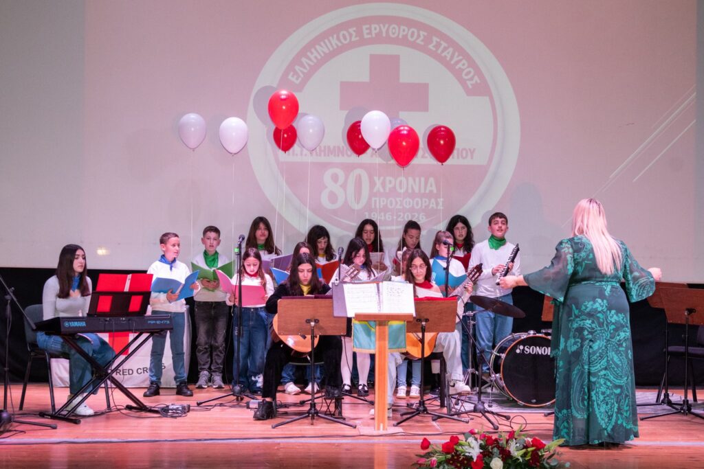 Στον χαιρετισμό του, ο Πρόεδρος του Περιφεριακού Συμβουλίου, κ. Δημήτριος Αχιλαδέλλης, αφού χαιρέτισε τους προσκεκλημένους, ευχαρίστησε τον Πρόεδρο του ΕΕΣ, για την τιμήτική παρουσία του στην εκδήλωση εορτασμού των 80 χρόνων κοινωνικής προσφοράς και αλληλεγγύης στην τοπική κοινωνία, καθώς και για την αμέριστη συμπαράσταση και βοήθειά του. Αναφέρθηκε στον σκοπό της εκδήλωσης, που είναι η ιστορική αναδρομή του ανθρωπιστικού έργου του Τμήματος στην 80χρονη διαδρομή του, με έκθεση φωτογραφιών, στολών κλπ κειμηλίων, στο φουαγιέ του κινηματοθεάτρου, αλλά και η απόφαση να τιμήσουμε τους Ανθρώπους μας, τους ανιδιοτελείς Εθελοντές και φίλους για την Ερυθροσταυτική προσφορά τους.