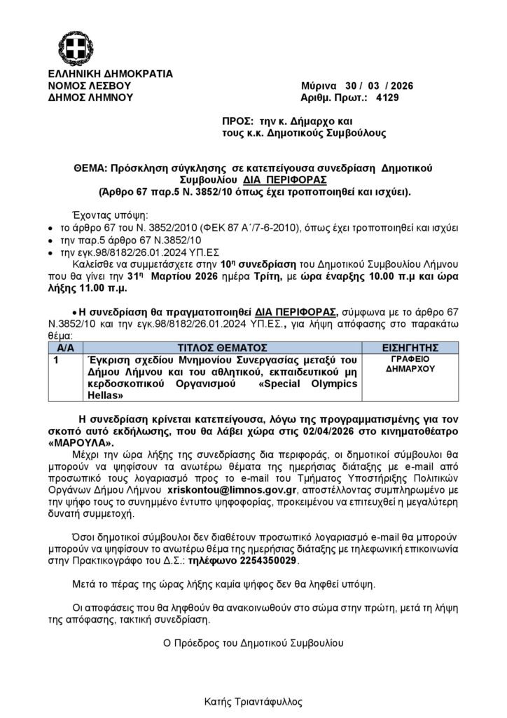 Πρόσκληση σύγκλησης κατεπείγουσας συνεδρίασης του Δημοτικού Συμβουλίου ΔΙΑ ΠΕΡΙΦΟΡΑΣ αύριο Τρίτη.
