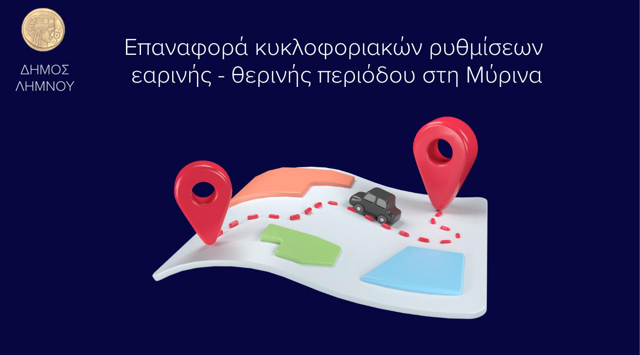 Υπενθυμίζουμε ότι από 01/04 έως την 31/10 ισχύουν εποχιακές κυκλοφοριακές ρυθμίσεις στη Μύρινα ως εξής: