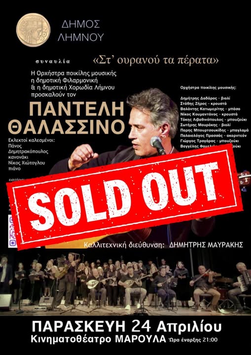 Ενημερώνουμε το κοινό ότι τα εισιτήρια για τη συναυλία του Παντελή Θαλασσινού την Παρασκευή 24 Απριλίου στο κινηματοθέατρο «Μαρούλα» έχουν εξαντληθεί μέσω προπώλησης.