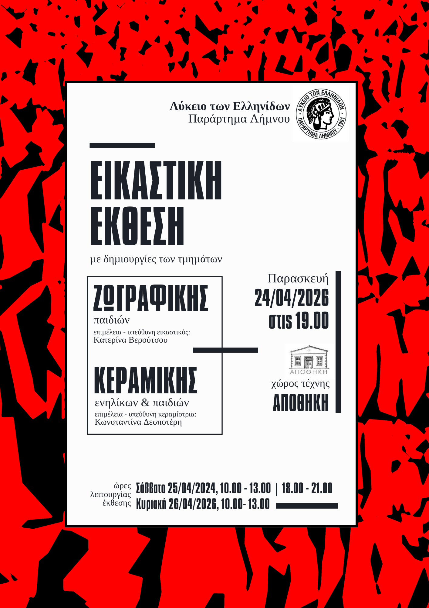 Πλησιάζοντας προς το τέλος μιας ιδιαίτερα δημιουργικής χρονιάς για τα εργαστήρια ζωγραφικής και κεραμικής του Λυκείου των Ελληνίδων Λήμνου, τα έργα όλων μας των καλλιτεχνών, μικρών και μεγάλων, παρουσιάζονται από κοινού στην εικαστική έκθεση που πραγματοποιείται 24 με 26 Απριλίου στον χώρο τέχνης ΑΠΟΘΗΚΗ.