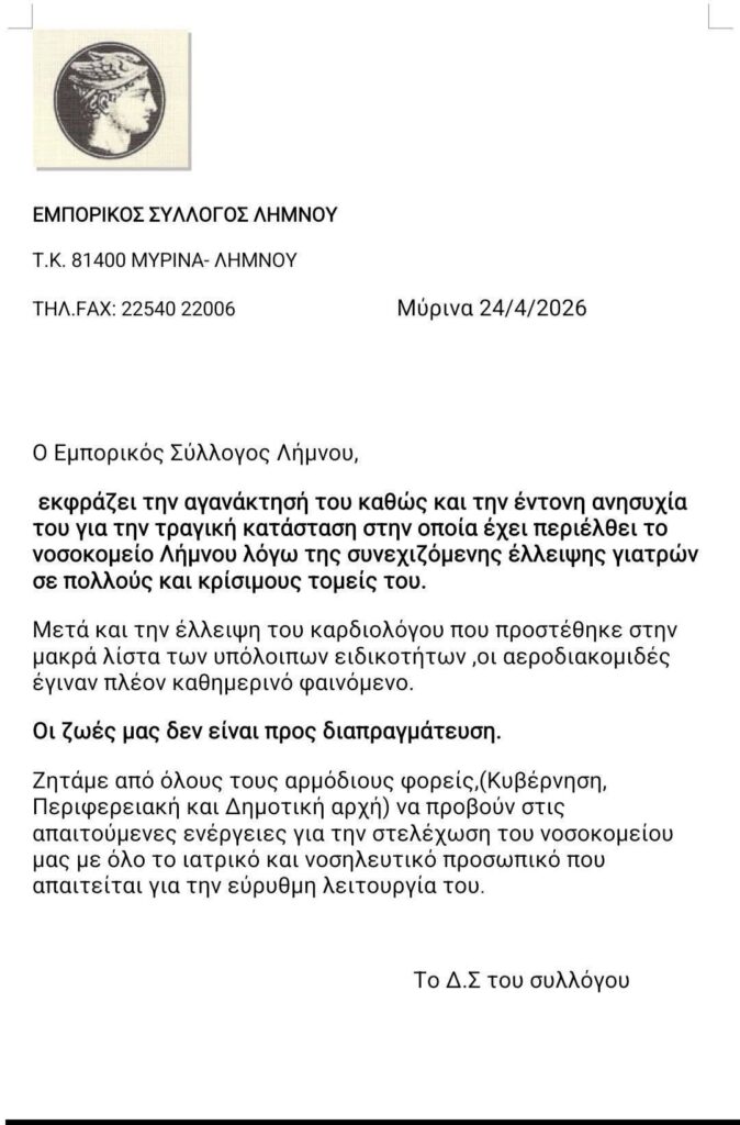 Ο ΕΜΠΟΡΙΚΟΣ ΣΥΛΛΟΓΟΣ ΕΚΦΡΑΖΕΙ ΤΗΝ ΑΓΑΝΑΚΤΗΣΗ ΤΟΥ ΓΙΑ ΤΙΣ ΤΡΑΓΙΚΕΣ ΕΛΛΕΙΨΕΙΣ ΤΟΥ ΝΟΣΟΚΟΜΕΙΟΥ ΛΗΜΝΟΥ