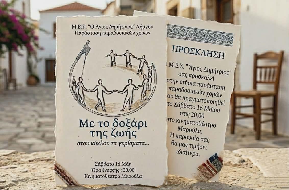 Σε μια βραδιά αφιερωμένη στην ελληνική παράδοση, ο Μ.Ε.Σ. «Άγιος Δημήτριος» Λήμνου διοργανώνει την ετήσια παράσταση παραδοσιακών χορών, με τίτλο «Με το δοξάρι της ζωής – στου κύκλου τα γυρίσματα…».