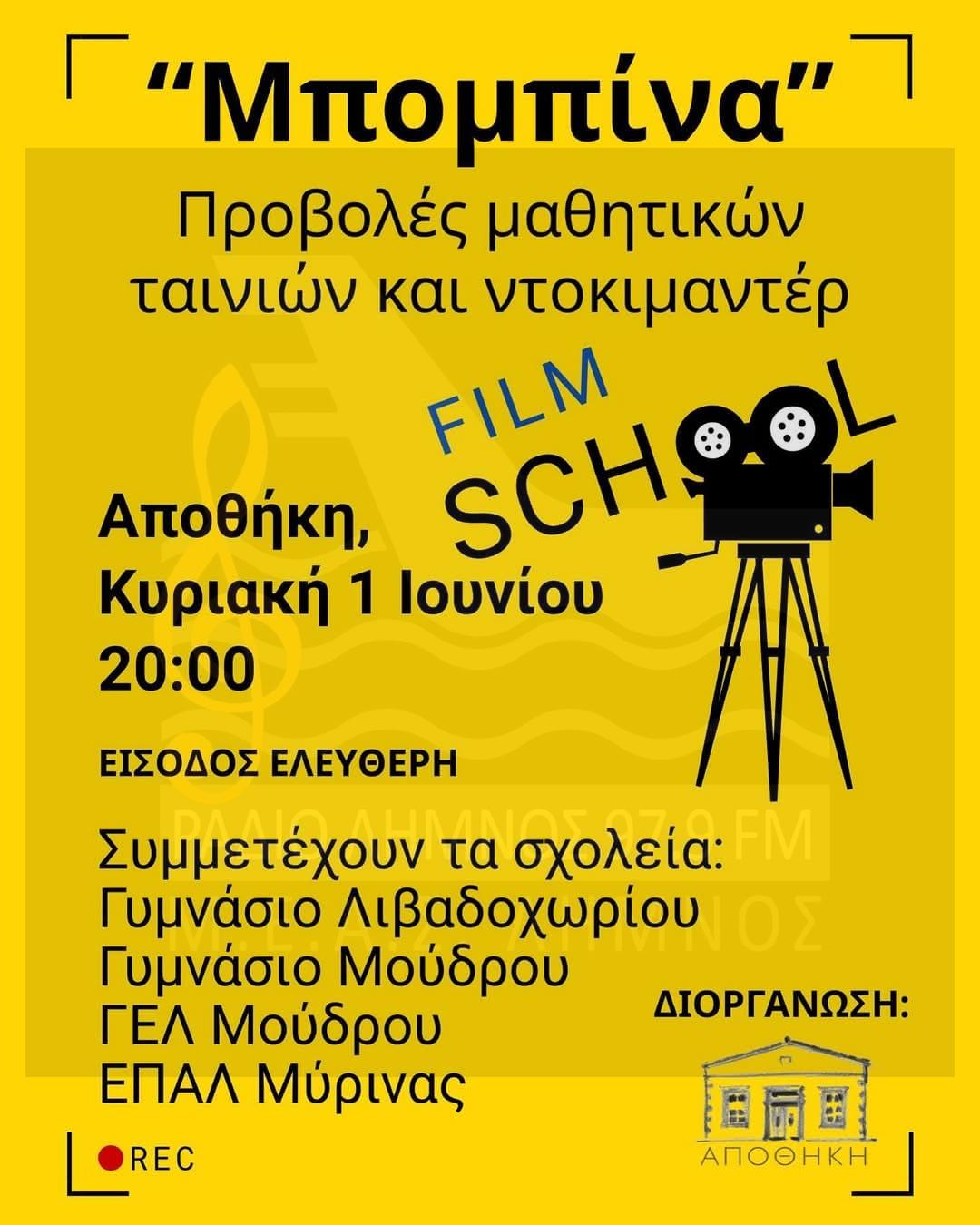 Για δεύτερη συνεχόμενη χρονιά, η Αποθήκη πραγματοποιεί την «Μπομπίνα», μια διοργάνωση με προβολές μαθητικών ταινιών και ντοκιμαντέρ από σχολεία της Λήμνου την Κυριακή, 1 Ιουνίου στις 20:00.