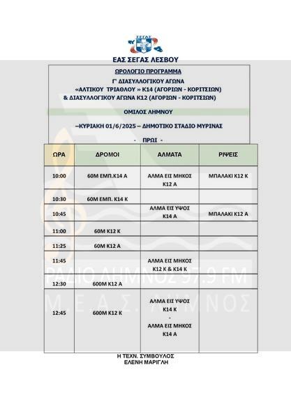 Η ΄Ενωση Αθλητικών Σωματείων ΣΕΓΑΣ Λέσβου κλείνει τον κύκλο των διοργανώσεών της Εαρινής περιόδου 2025 και των Διασυλλογικών της αγώνων , με τον Γ΄ Αγώνα Κ-14 Αγοριών – Κοριτσιών «ΑΛΤΙΚΟΥ ΤΡΙΑΘΛΟΥ» & Κ12 (Αγοριών-Κοριτσιών) ατομικών αγωνισμάτων που θα πραγματοποιηθούν σε δύο ομίλους όπως παρακάτω: