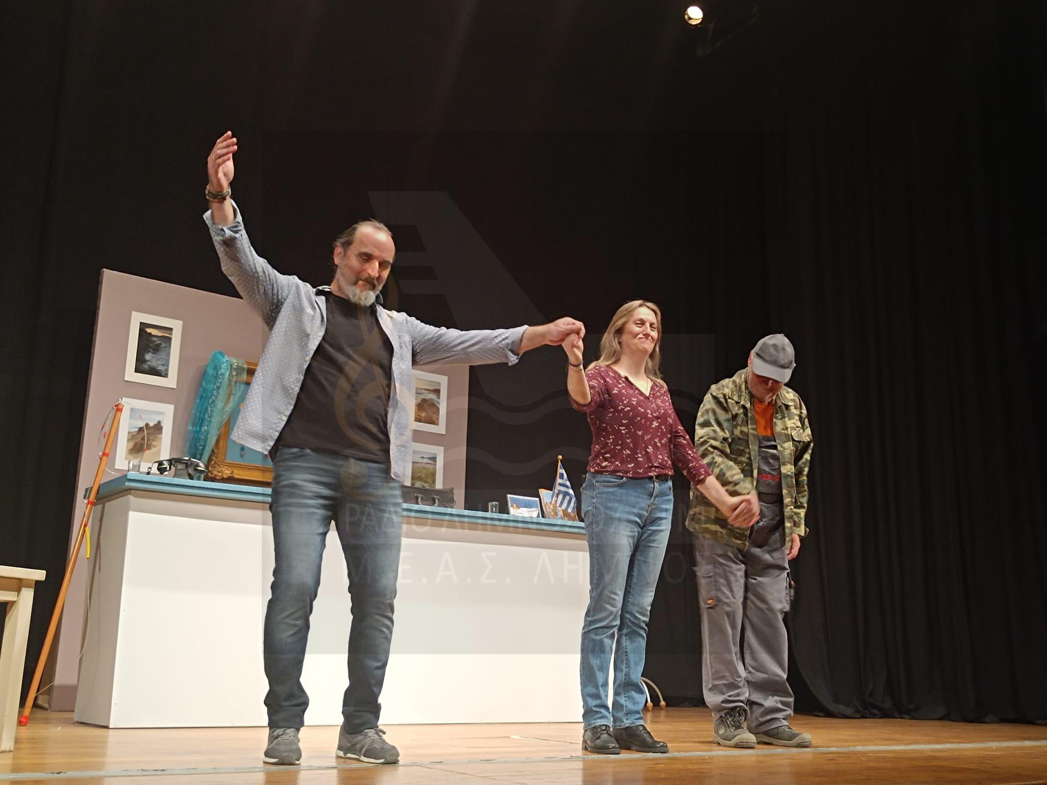 Θερμά συγχαρητήρια στη Λαϊκή Σκηνή Μ.Ε.Α.Σ “ΛΗΜΝΟΣ” , στους σκηνοθέτες Γιώργο Καριακλή και Δέσποινα Παπαδοπούλου, τους ηθοποιούς Θανάση Τζάνερο, Νίκο Πλάντζο, Δέσποινα Λάζου και σε όλους τους συντελεστές.