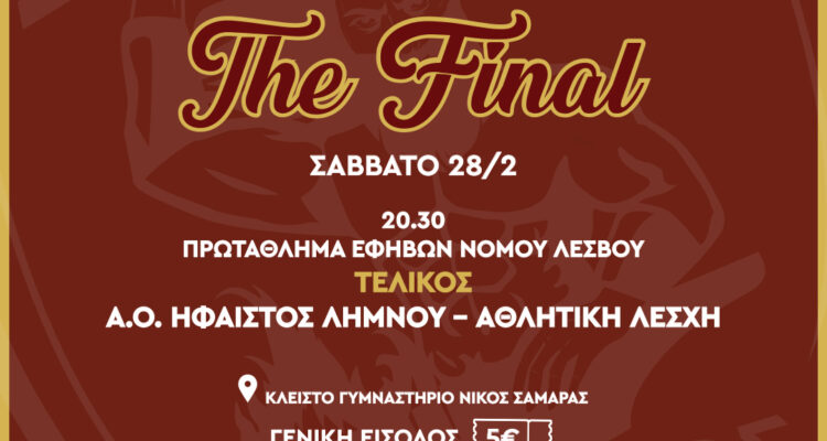 Σάββατο 28/2 20.30 Πρωτάθλημα Εβήβων Νομού Λέσβου Τελικός Πρωταθλήματος Α.Ο. Ήφαιστος - Αθλητική Λέσχη Κλειστό…