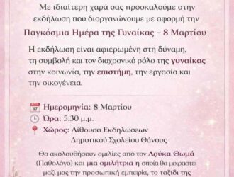 Ο Πολιτιστικός Σύλλογος Θάνους διοργανώνει εκδήλωση την Κυριακή 8 Μαρτίου,…